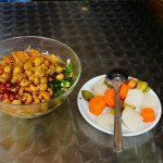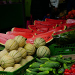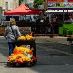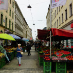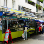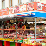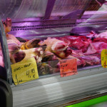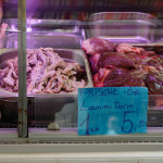Veganer müssen auf diesem Markt stark sein, auch wenn bei den vielen Gemüsestände die Früchte und Kräuter leuchten, Käse in allen Variationen und Gewürze aus allen Ländern der Welt verkauft werden – Fleisch ist eines seiner Hauptprodukte. In den Fleischständen stapeln sich Lammkeulen, Hühnerflügel, Rinderhaxen, Putenhälse, Ziegenfleisch teilweise bis zu einem Meter hoch in den Auslagen. Ab Mengen von drei und zehn Kilo wird es noch preiswerter angeboten – und wandert in diesen Mengen auch über die Theke. Muss ich in Jena Rinderherzen und Flecken mühsam beim Fleischer bestellen, wenn ich damit Freunde bekochen will, so gibt es sie hier einfach schockweise, auch geruchstechnisch. Der serbisch-ungarische Stand hat sich dagegen auf Schweinefleisch und -innereien aller Art spezialisiert. Und auch zunächst Absonderliches wird angeboten – Rinderfüße, Lammdärme, Rinderhaut und abgeschlagene und abgehäutete Hammelköpfe. Ganz neue Reize und kulinarische Herausforderungen tun sich da für mich küchentechnisch auf, schade dass solche Zutaten eine Zugfahrt nach Thüringen nicht überleben würden.