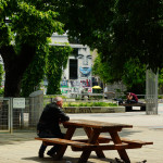 Am Ende biege ich in den Yppenplatz ab. Da es Mittwoch ist, ist er leer. Passanten dösen auf Parkbänken. An seiner Nordseite sitzen Leute in den alternativen Cafès. Eine Gruppe Jungs spricht mich an, ob ich sie fotografieren könne. Nachdem sie posiert haben und das Ergebnis bestaunen, frage ich nach einer Mailadresse, wohin ich es denn nun schicken solle. Die Jungs fangen an rumzudrucksen, einer knetet eine Rolle Geldscheine in seiner Hand. Über den Platz zieht eine schwere Brise Marihuana… Somit bleibt das Foto auch hier unveröffentlicht.