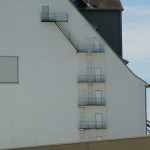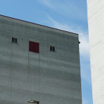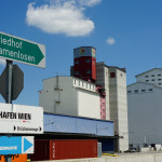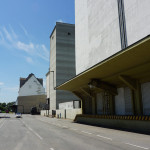 Ich laufe durch den Hafen, der überwiegend dem Getreideverladen dient. Große Speicher stehen hier, helle, gerade, nur der Funktion unterworfene Formen, ein paar hingeworfene Graffiti an den Wänden. Laster aus Ungarn, der Slowakei und der Ukraine schütten die Körner in sie hinein. Darüber spannt sich ein kitschiger blauer Himmel mit kleinen weißen Wolken. Wer mich kennt weiß, dass ich hier gern meine Fotomotive finde.