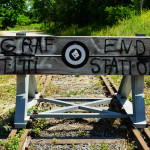 Die Hafenbahn stoppt an einem Prellbock, auf dem „Graffitiendstation“ gesprüht ist. Dahinter versucht der Fischereiverein, mit zwei kleinen Häuschen und und kleinem Garten ein Idyll gegen den Krach des Hafens vorzutäuschen. Recht davon befindet sich der gesuchte Ort.