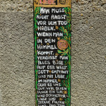 An der Kapelle ist eine Stele angebracht, auf der eine neunjährige Sara schreibt: „Man muss nicht Angst vor dem Tod haben. Wenn man in den Himmel kommt, vergisst man alles Böse auf der Welt. Gott empfängt uns mit Liebe. Im Himmel geht es uns gut. Wir gehen durch ein Tor und Schmetterlinge und Sterne folgen uns.“