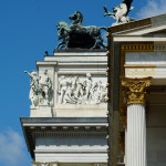 Doch was ist nun mit dem Kaiser im Nachthemd? Franz Josef hat das Parlament nie gemocht. So verzichtete er auch auf sein Rechte und Pflichten, ähnlich wie der englische König die jeweiligen Parlamentsperioden mit einer Thronrede zu eröffnen. Nichts desto trotz wurde er als oberster Repräsentant des Staates auf dem Gebäude abgebildet. Am Giebel nimmt er die Huldigungen der Kronländer entgegen, gekleidet im klassischen antiken Stil mit einer Toga. Die Wiener war dieses Kleidungsstück scheinbar nicht bekannt, da sich zudem eine gewisse Ironie zu dem Kaiser und seinem ungeliebten Gebäude einstellte, wurde er als Kaiser im Nachthemd verspottet.