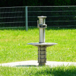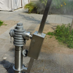 Mit eine Ring an den Hydranten befestigt, ist die Dusche mit einer der Schlauchöffnungen verschraubt (die im Ernstfall schnell abgeschraubt ist), ein kleines Solarpaneel sorgt oben auf der Stange für die autarke Energieversorgung einer elektronische Steuereinheit, die je nach Temperatur, Luftfeuchtigkeit und Tageszeit das Wasser für die Düsen an der Stange freigibt. Genügend Druck liegt über die Leitung zum Hydranten schon an. Tata! Einfach und unabhängig von der Umgebung, da hat jemand nachgedacht.