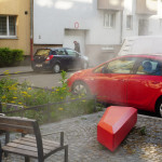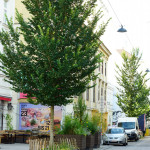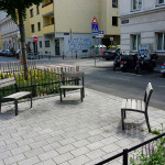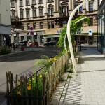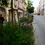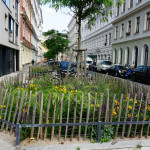 Die Trinkbrunnen hier in Wien werden redlich genutzt, auch um – damit gleich das nächste Reizthema angesprochen wird – die zahlreichen Blühstreifen in der Stadt mit Wasser zu versorgen. Diese gibt mittlerweile an vielen Straßen, dafür werden diese sogar z.T. verschmälert, wofür die Parkplätze am Straßenrand eingespart werden. Und sie existieren oft durch ein hier scheinbar normales, unauffälliges, bürgerliches Mitmachen. Ich habe in Wien bisher keine Wagen wie in Jena gesehen, die durch die Straße fahren und die Bäume und Beete am Straßenrand gießen (nur in Parks gab es so etwas auch in dieser Stadt), hier macht es die Nachbarin oder Ladeninhaber aus dem nächsten Hydranten heraus. Und auch das benachbarte Parklett kriegt eine Schwapps ab.