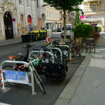 Upps, noch so komische Dinger. Während in Jena zwei derartige pro forma „Pilotprojekt“-Kästen ihrer Verwahrlosung entgegensehen (und dabei heftig auf social media bekämpft werden), sind diese Parkletts in Wien in den inneren Bezirken zwischen Ringstraße und Gürtel fast flächendeckend sichtbar und breiten sich auch immer mehr in die weiteren Randbezirke aus. Oft individuell gestaltet, dienen sie nicht nur als grüne Sitzgelegenheiten, die Kneipen und auch Geschäfte bekommen die Genehmigung, solche Konstruktionen vor ihren Adressen auf der Straße aufzustellen, um ihre Gäste zu bewirten oder ihren Kunden Sitzplätze anzubieten.