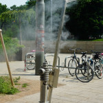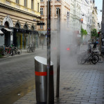 Und nun noch die Nebelduschen, hier kenne ich keine Zahlen, habe diese aber überall in Wien schon gesehen. Gerade oder gebogene Rohre, die aus den Gehsteigen aufragen und zur Seite aus vielen kleinen Düsen feinste Wassertröpfchen versprühen, die der Wind dann durch die Straßen treibt. Und – natürlich – haben die Wiener auch für ihre Feuerwehrhydranten wiederum eine Lösung gefunden.